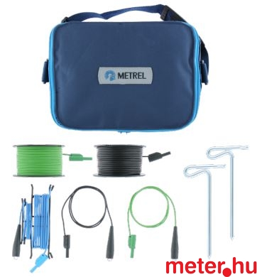 3-vezetékes méréshez. Tartalmaz: 2 db 50 m-es (fekete és zöld) vezetéket, 1 db 4,5 m-es kék vezetéket, 2 db 1 m-es (fekete és zöld), 2 db földelő szondát és nagyméretű hordtáskát.