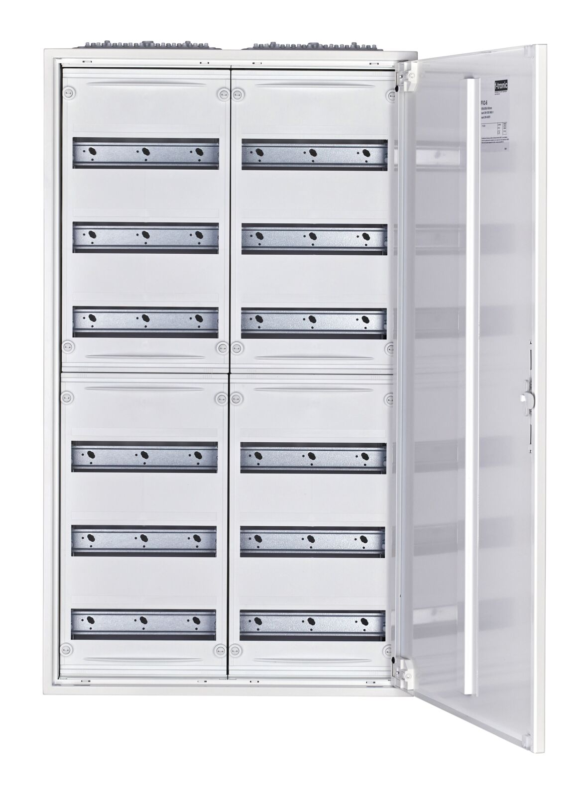 Az f-tronic FV2-6 2 mezős, falon kívüli (AP) mezőselosztó, amely kifejezetten nagyobb installációkhoz készült. Átütő membrános kábelbevezetései gyors szerelést tesznek lehetővé, a belső kialakítás pedig 6 soros, nagy modulkiosztást biztosít.