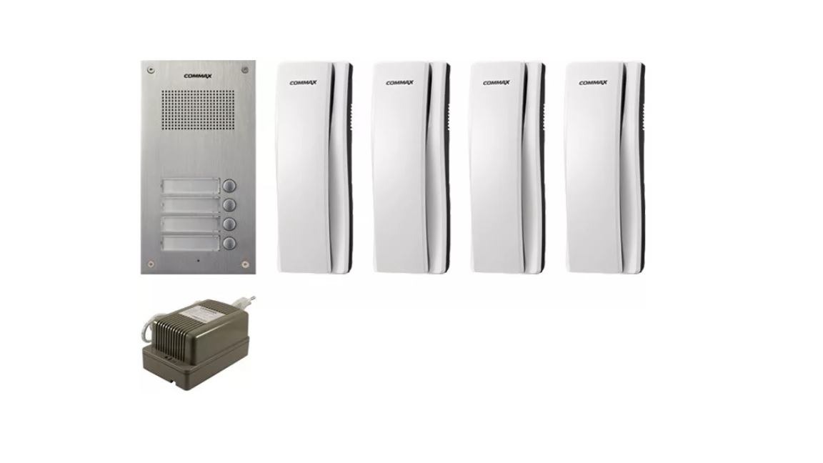 COMMAX DR-4UM + 4 db DP-SS + RF-1A 4 lakásos kaputelefon szett, süllyesztett, 4 db DP-SS beltéri készülékkel, 1 db trafóval.