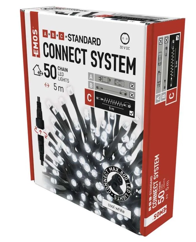 termék: lánc, fény színe: hideg fehér, méretek: 5 m, használat: kültéri és beltéri, távvezérlő: nem, funkció: világít, tápellátás típusa: AC (hálózati) adapter (nem a csomag része),LED-ek száma: 50, LED-ek közötti távolság: 10 cm, LED mérete: 5 mm, tápvezeték hossza: 10 cm, kábel színe: fekete, fogyasztás: max. 3 W, bemeneti feszültség: 30 V DC,védettség: IP44,