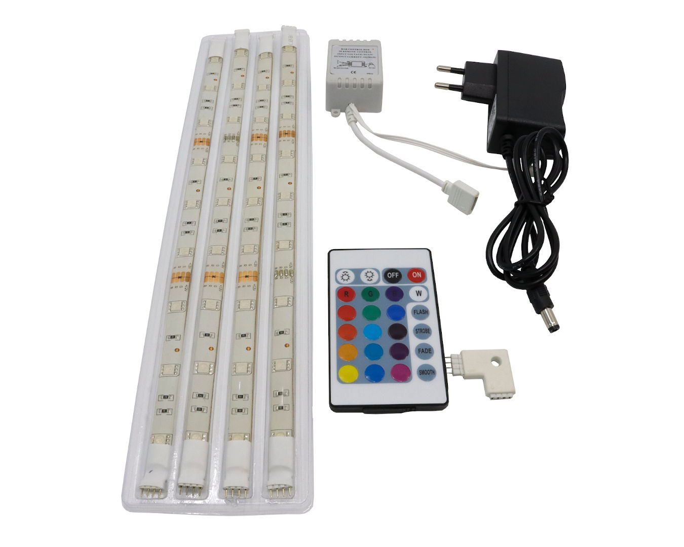 RGB LED pálcák távirányítóval és adapterrel, bliszteres csomagolásban.