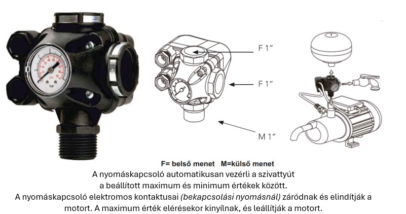 nyomáskapcsoló víz pm5_3w elágazó idommal és nyomásmérő órával