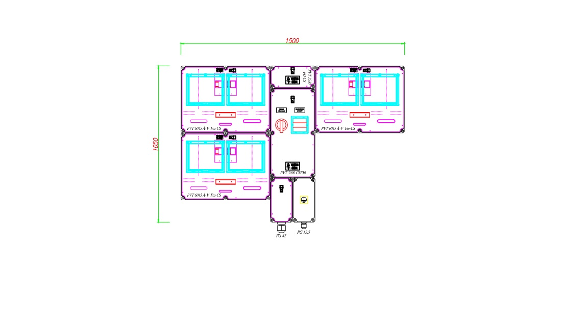 Három felhasználási helyes M63A csoportos mérés rendszer, felületre szerelt kivitelben, túlfeszültség levezető nélkül, tűzeseti leválasztóval.