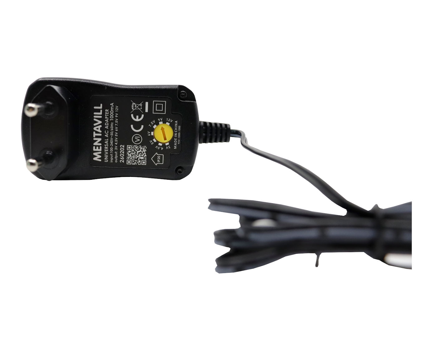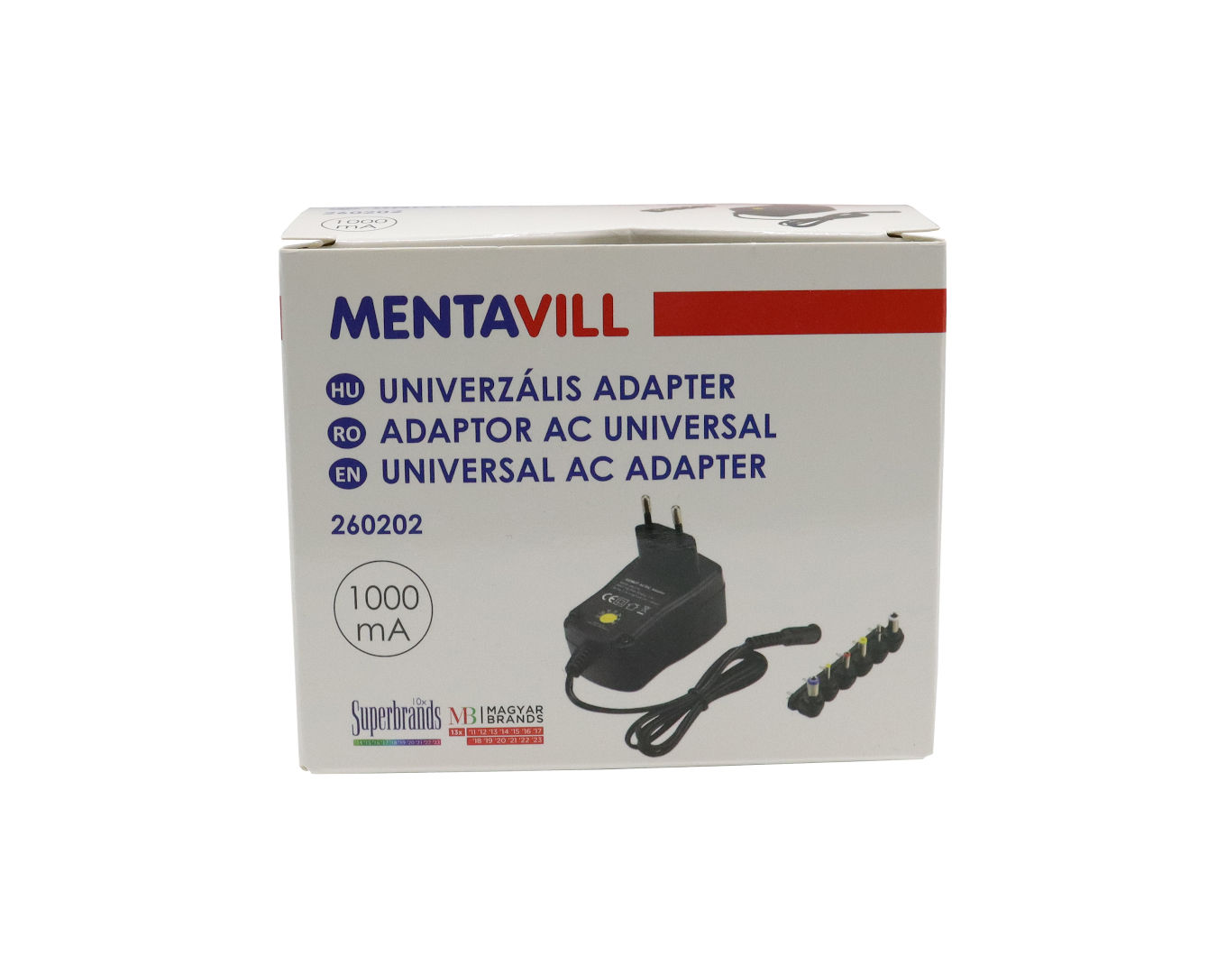 A Mentavill 260202 univerzális adapter ideális választás, ha többféle kisfeszültségű készüléket szeretne egyetlen tápegységgel működtetni. Állítható kimeneti feszültsége (3–12 V DC) és hat különböző csatlakozófeje révén számos eszközzel kompatibilis – legyen szó rádióról, routerről, LED-szalagról vagy kisebb elektronikai berendezésről. Főbb jellemzők: Kimeneti feszültség: 3 / 4.5 / 5 / 6 / 7.5 / 9 / 12 V DC Max. áram: 1000 mA, teljesítmény: 12 W Bemenet: 100–240 V ~ 50/60 Hz Hatásfok: 83,8% 6 féle cserélhető csatlakozófej Terhelés nélküli fogyasztás: < 0,1 W Előnyei: Egy adapter, több eszközhöz Energiatakarékos és biztonságos működés Kompakt, könnyű kivitel – ideális otthonra és útra
